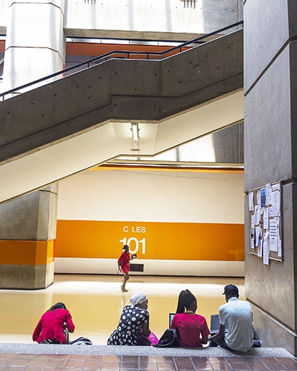 University of Johannesburg tornar upp sig som en brutalistisk borg i grå betong. Den är svår att hitta in i, men i dess kärna breder en öppen park ut sig där studenterna vilar i trädens skuggor.