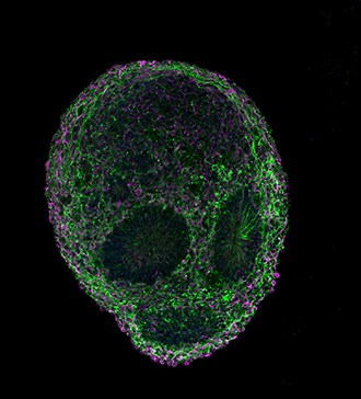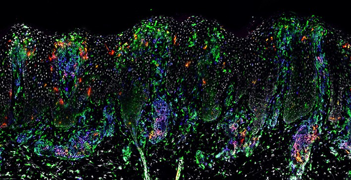 Men så dök en bild av en hårsäck upp. Den användes när forskarna letade efter cancer. Rosa, blått och grönt lyste mot den svarta ytan. Det såg ut som en lök med ett skott.