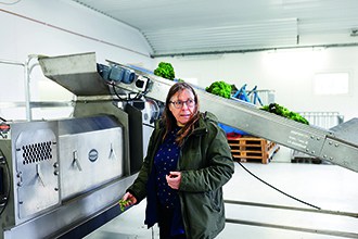 Hon plockar upp en näve av ett torrt grönkålshack som faller ut från maskinen, ner i en plastback.