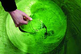 Det dånar när proteinfabrikens skruvpress börjar jobba med grönkålslasset. Genom olika processer extraheras proteinet ur bladen. En lukt av kål sprider sig i rummet. Skruvpressen används inte bara för grönkål utan för allt möjligt som rödklöver, vallgräs och blast från sockerbetor.