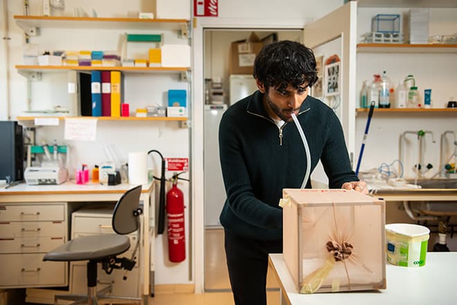 Rahul Krishnan samlar ihop fem myggor i godislådan och tar med dem ut i trapphuset och upp till labbet en våning upp. Här, i ett rum så litet att det närmast liknar en garderob, tillbringar han mycket tid.